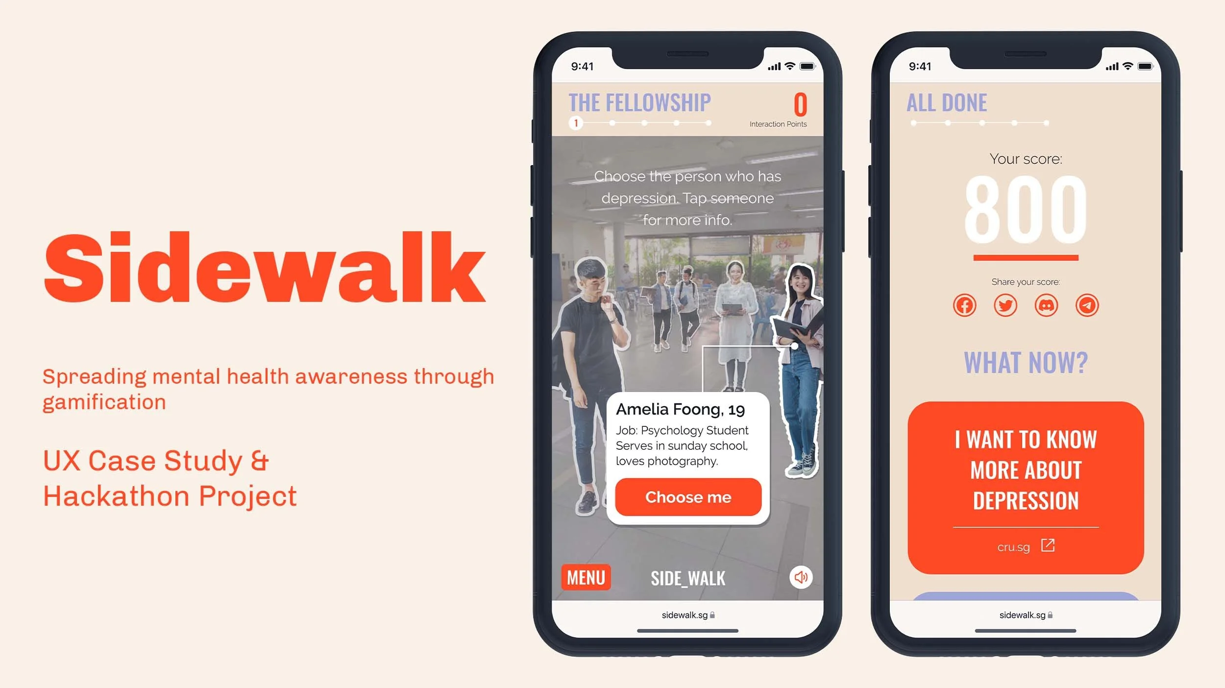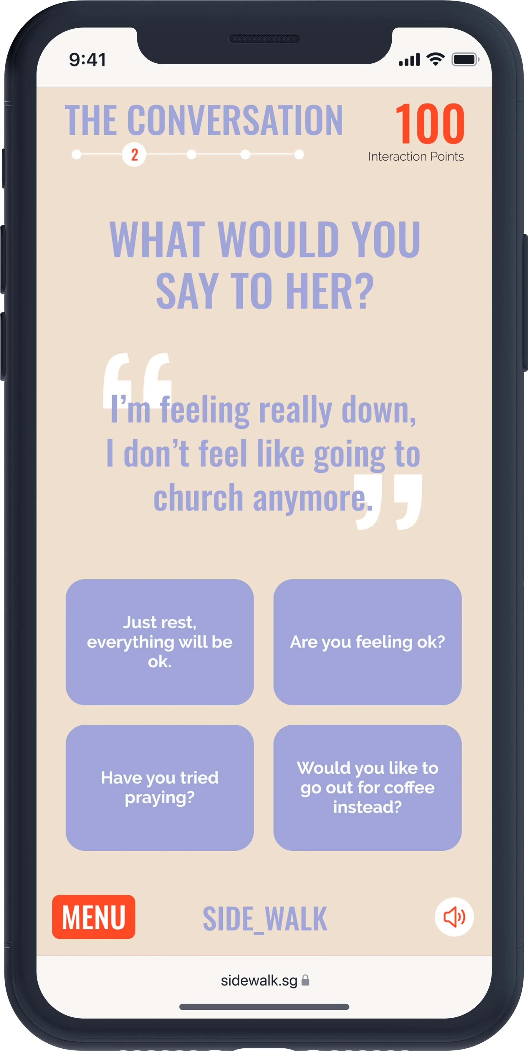 Sidewalk presents a text adventure game. Through the game, the player journeys with a church friend with clinical depression, while being presented with knowledge, tips and resources.