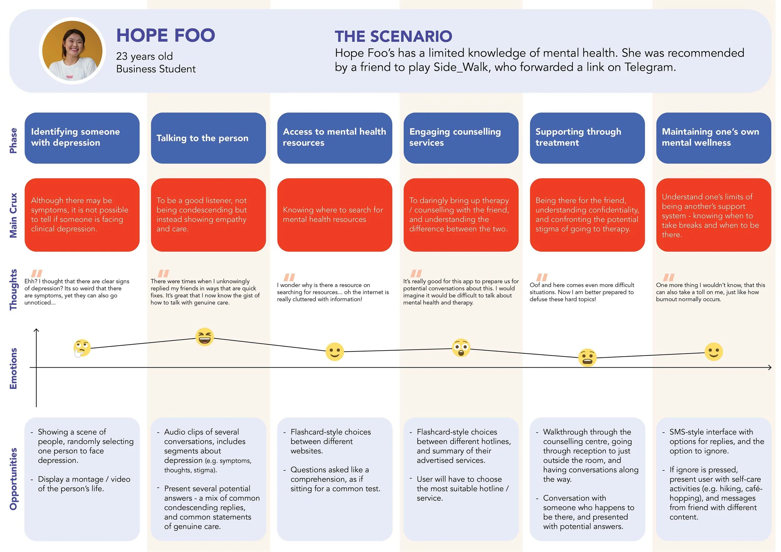 Ideate, but never assume: It is often mentioned that UX designers are not the end users, and what more is advocating for mental health issues as someone who is not suffering from a clinically-diagnosed mental condition.