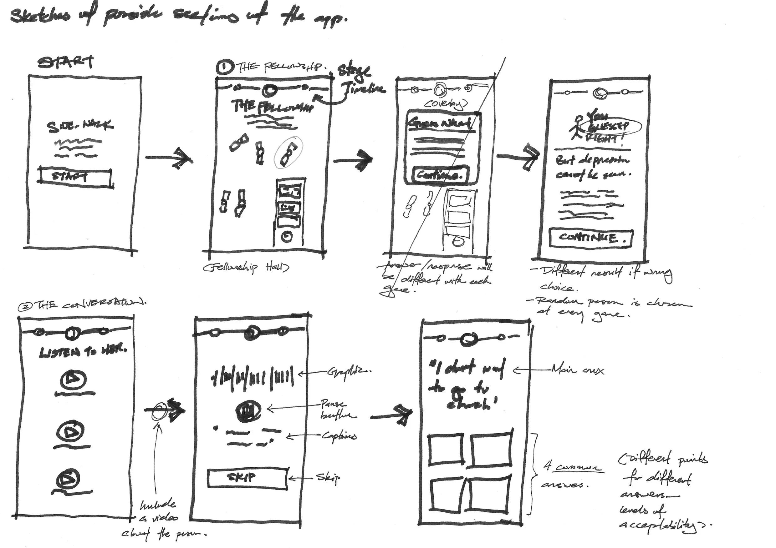 After a framework was drafted, I revisited our previous wireframes and mockups, placing them into the respective phases and ideating for other possible formats to drive the message across. This time round, wireframes were done on quick sketches.
