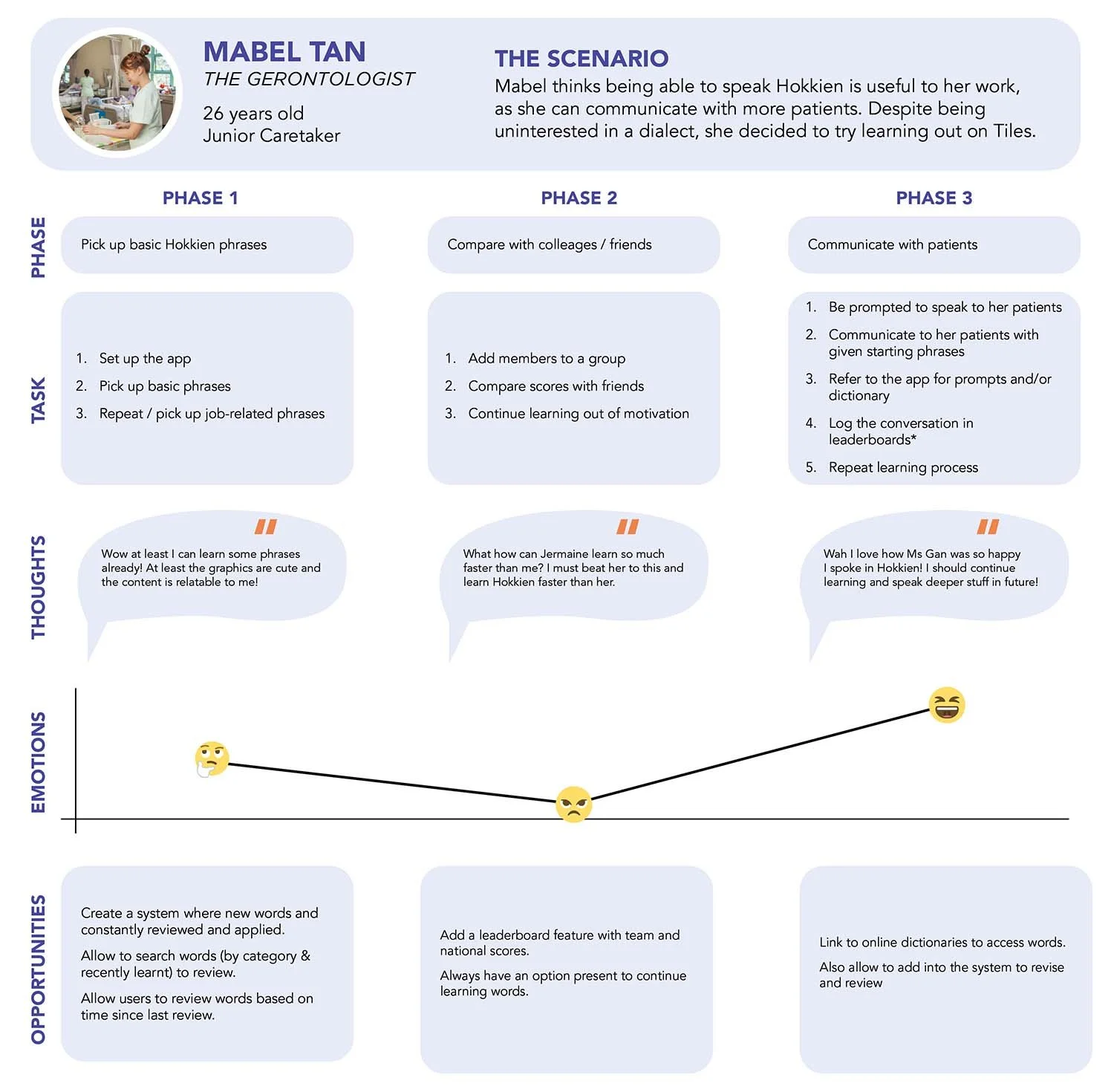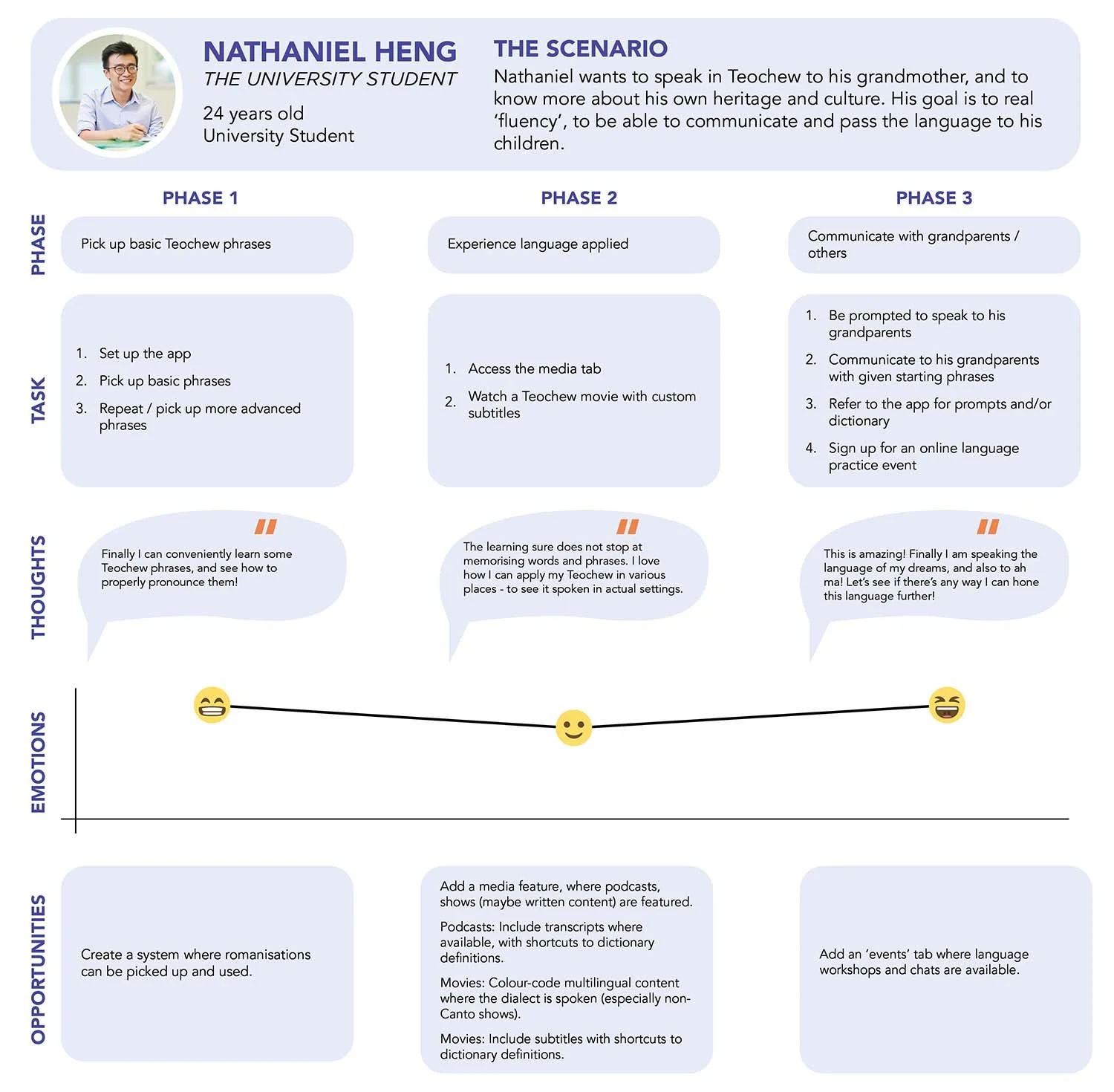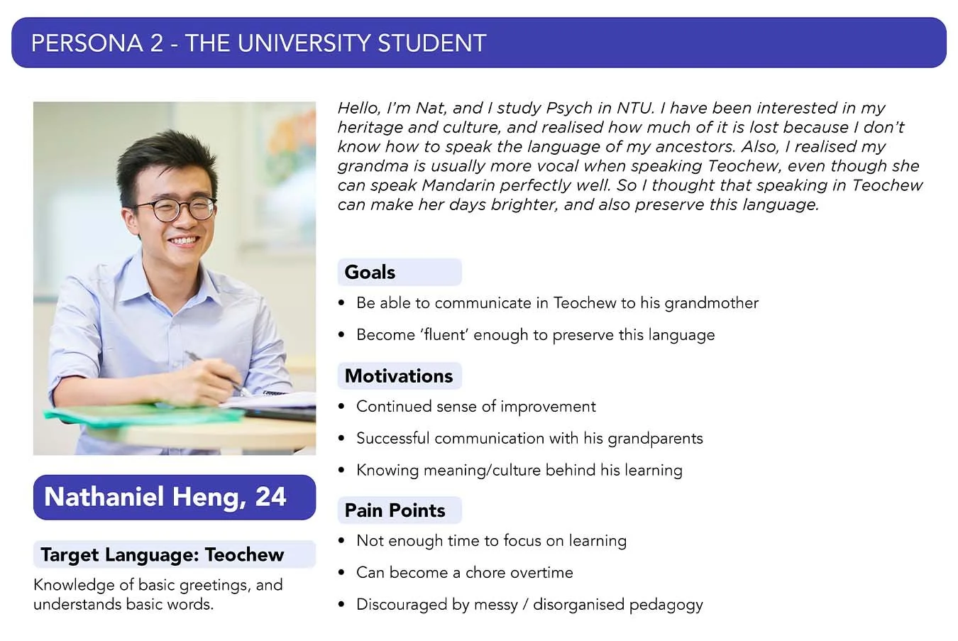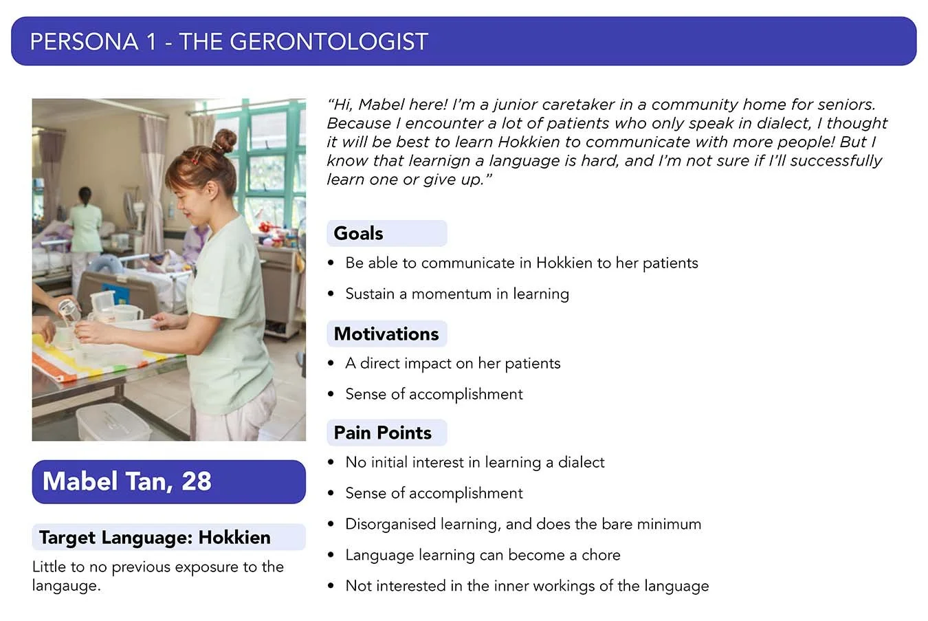 Be insight- not solution-driven. I embarked on this project with a lot of pre-understanding and pre-conceived ideas, which were challenged once ample user research was done, and are not reflective of the facts on the ground. For example, I discovered a general lack of interest in dialect-learning, which called into question the initial idea of creating a generic (but dialect-centric) language-learning app. However, other opportunities arise from taking in users’ practical needs, leading to an emphasis in this direction.