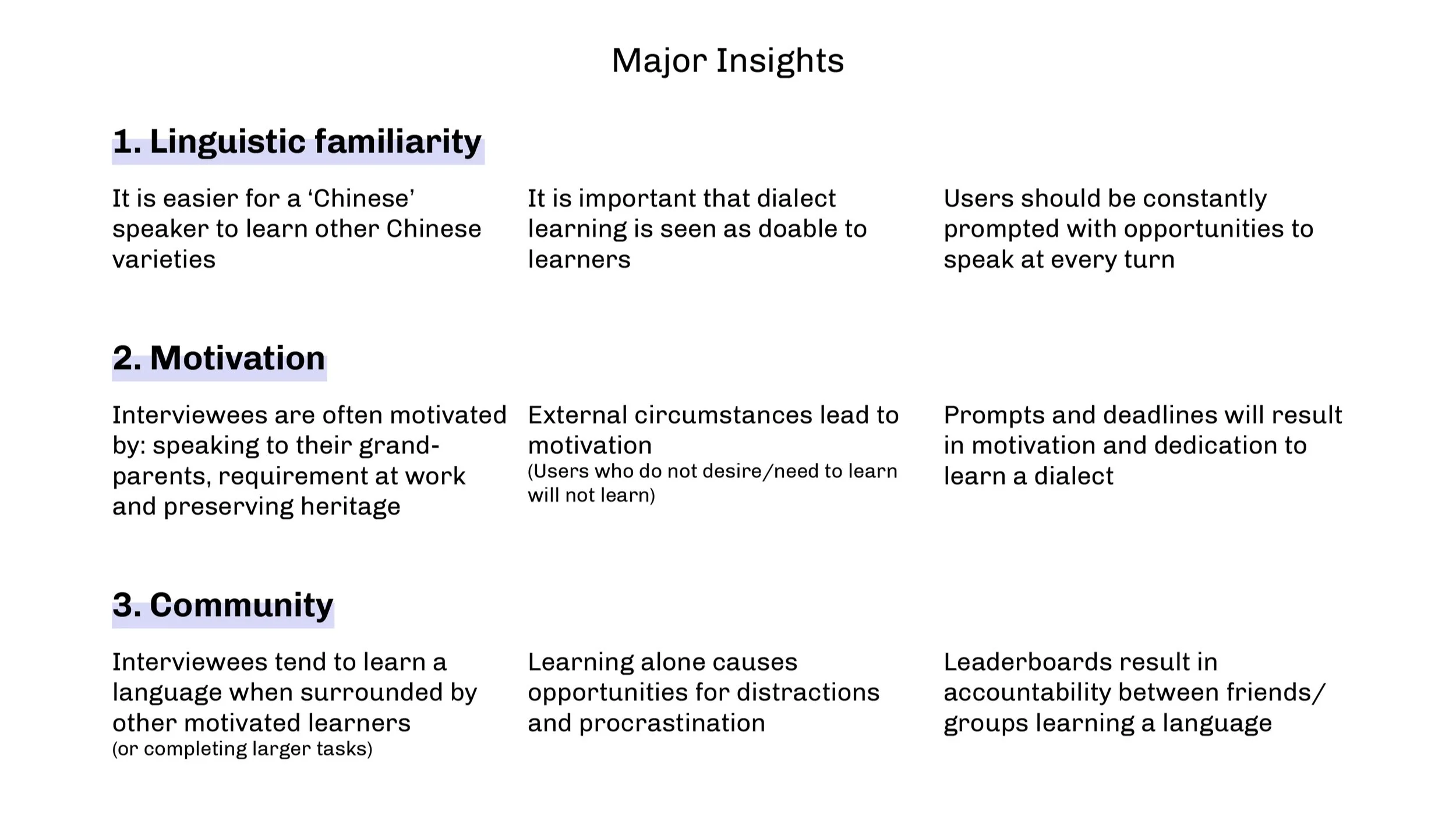 Based on user research and observation, I noticed dialect learners tend to give up due to lacking access to dialect learning platforms (and vocabulary) as well as a lack of opportunities to proactively practice the language.
